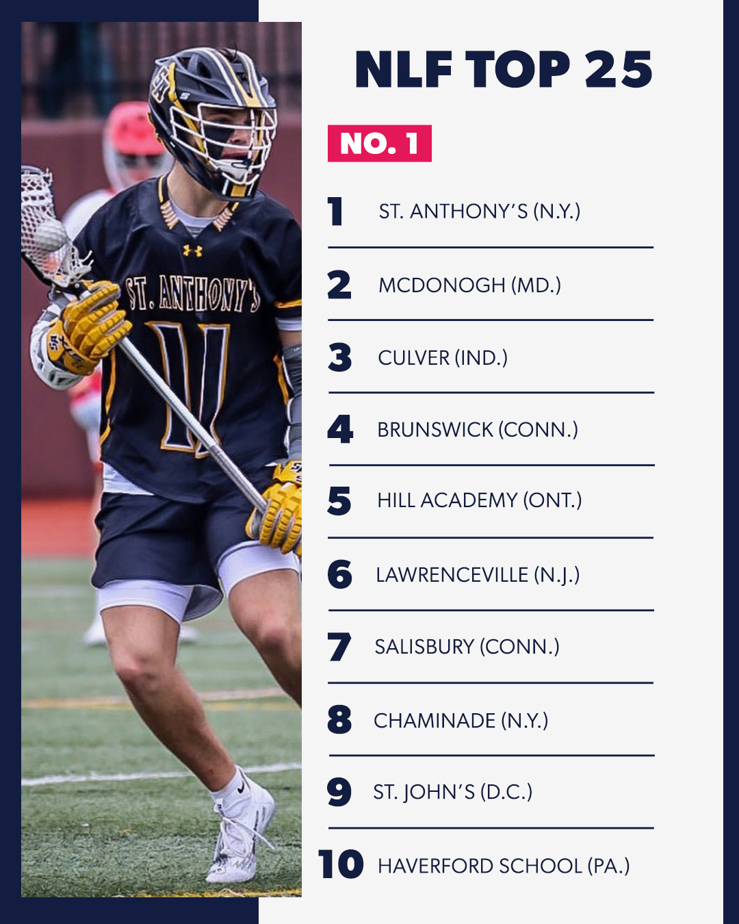 The Indians make an appearance at No. 13 in the first NLF high school rankings of the season. Manhasset is one of five Long Island teams, including No. 1 St. Anthony’s, in the rankings. The Indians don’t play the Friars this year, but they’ll have an opportunity for the other top 10 program from the Island as they play No. 8 Chaminade on May 13 in the annual Reg’s Rock game.